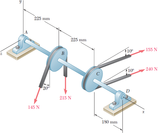 Two 150-mm-diameter pulleys are mounted on line shaft AD. The belts at B and C lie in vertical planes parallel to the y z plane. Replace the belt forces shown with an equivalent force-couple system at A.