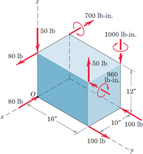 Determine the resultant of the force and couple system which acts on the rectangular solid.