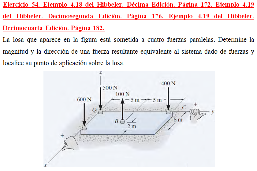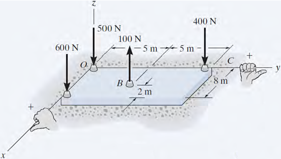 La losa que aparece en la figura está sometida a cuatro fuerzas paralelas. Determine la magnitud y la dirección de una fuerza resultante equivalente al sistema dado de fuerzas y localice su punto de aplicación sobre la losa.