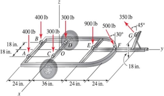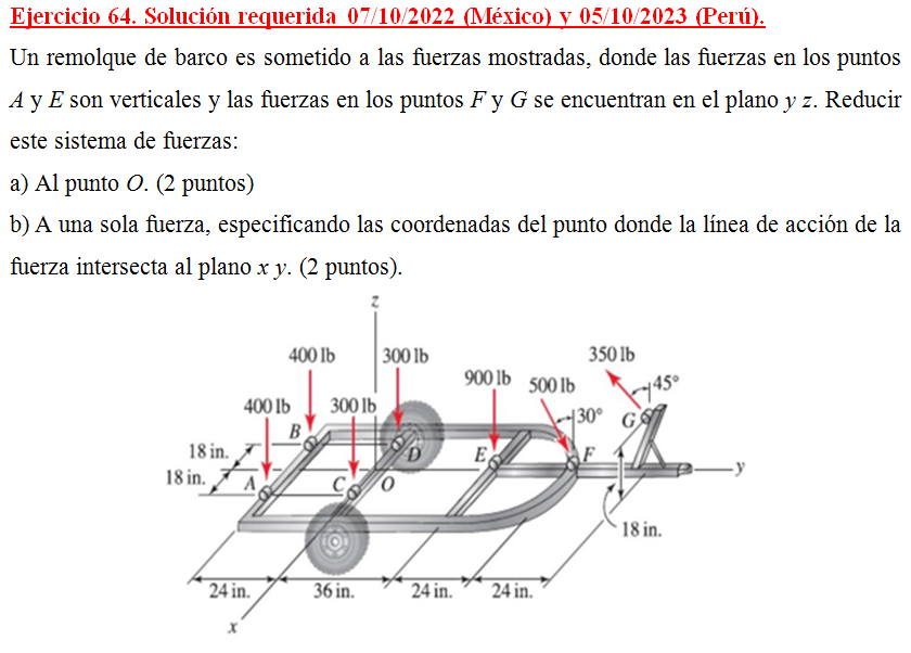 Un remolque de barco es sometido a las fuerzas mostradas, donde las fuerzas en los puntos A y E son verticales y las fuerzas en los puntos F y G se encuentran en el plano y z. Reducir este sistema de fuerzas: