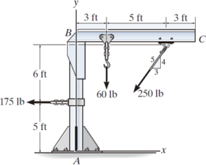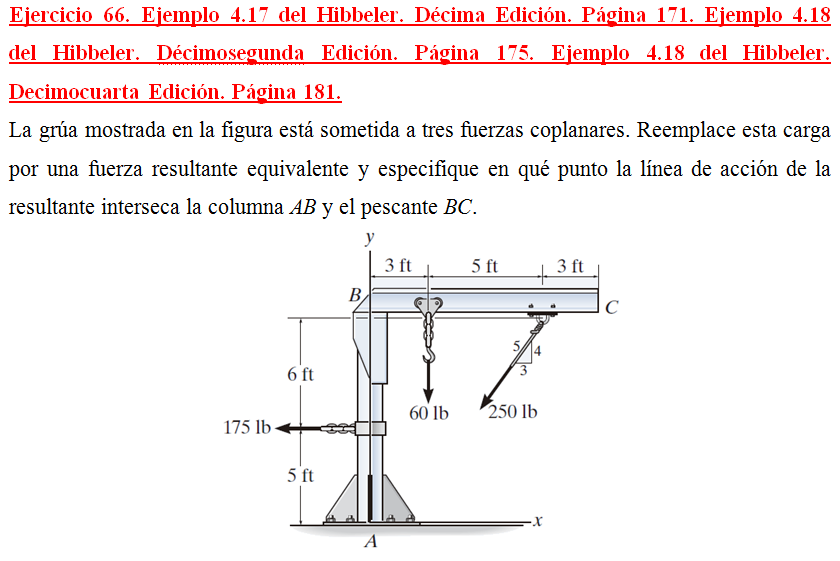 La grúa mostrada en la figura está sometida a tres fuerzas coplanares. Reemplace esta carga por una fuerza resultante equivalente y especifique en qué punto la línea de acción de la resultante interseca la columna AB y el pescante BC.
