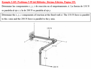 Determine las componentes x, y, z de reacción en el empotramiento A. La fuerza de 150 N es paralela al eje z y la de 200 N es paralela al eje y.