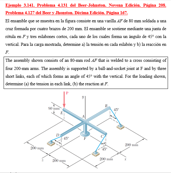 El ensamble que se muestra en la figura consiste en una varilla AF de 80 mm soldada a una cruz formada por cuatro brazos de 200 mm. El ensamble se sostiene mediante una junta de rótula en F y tres eslabones cortos, cada uno de los cuales forma un ángulo de 45° con la vertical. Para la carga mostrada, determine a) la tensión en cada eslabón y b) la reacción en F.