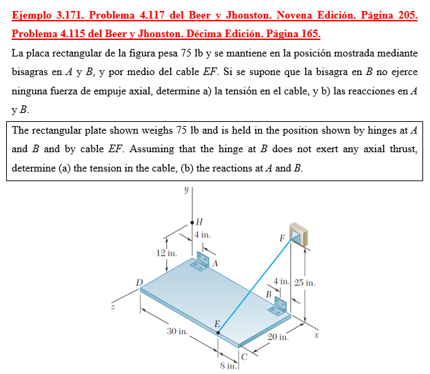 La placa rectangular de la figura pesa 75 lb y se mantiene en la posición mostrada mediante bisagras en A y B, y por medio del cable EF. Si se supone que la bisagra en B no ejerce ninguna fuerza de empuje axial, determine a) la tensión en el cable, y b) las reacciones en A y B.