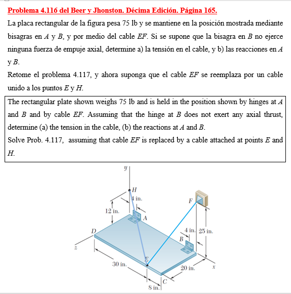 La placa rectangular de la figura pesa 75 lb y se mantiene en la posición mostrada mediante bisagras en A y B, y por medio del cable EF. Si se supone que la bisagra en B no ejerce ninguna fuerza de empuje axial, determine a) la tensión en el cable, y b) las reacciones en A y B.