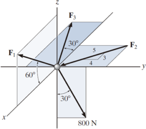 Determine las magnitudes de F1, F2 y F3 necesarias para el equilibrio de la partícula.