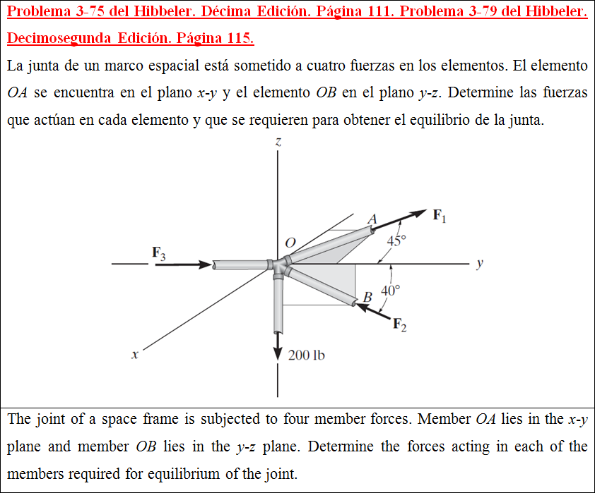 La junta de un marco espacial está sometido a cuatro fuerzas en los elementos. El elemento OA se encuentra en el plano x–y y el elemento OB en el plano y–z. Determine las fuerzas que actúan en cada elemento y que se requieren para obtener el equilibrio de la junta.