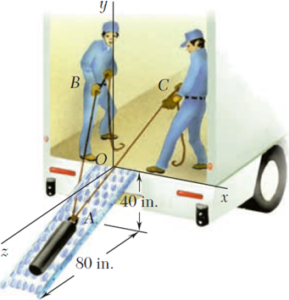 Dos trabajadores descargan de un camión un contrapeso de 200 lb de hierro fundido usando dos cuerdas y una rampa con rodillos. Suponga que un tercer trabajador ejerce una fuerza P = (– 40 i) lb sobre el contrapeso. Si se sabe que en el instante mostrado el contrapeso está inmóvil, determine la tensión en cada cuerda si las coordenadas de posición de los puntos son A ( 0 , – 20 in , 40 in ), B ( – 40 , 50 in , 0 ) y B ( 45 in , 40 in , 0 ), respectivamente. Suponga que no hay fricción entre la rampa y el contrapeso. (Sugerencia: Puesto que no hay fricción, la fuerza ejercida por la rampa sobre el contrapeso debe ser perpendicular a éste).