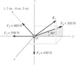 Determine la magnitud y dirección de F1 requeridas para mantener el sistema de fuerzas concurrentes en equilibrio.