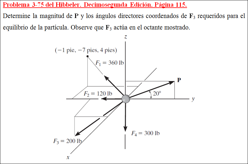 Determine la magnitud de P y los ángulos directores coordenados de F3 requeridos para el equilibrio de la partícula. Observe que F3 actúa en el octante mostrado.