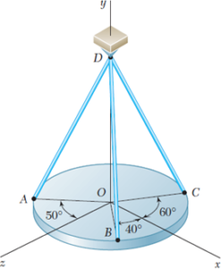 Una placa circular horizontal que pesa 60 lb está suspendida de tres alambres que forman ángulos de 30º respecto de la vertical y se encuentran unidos a un soporte en D. Determine la tensión en cada alambre.