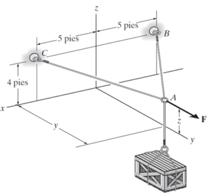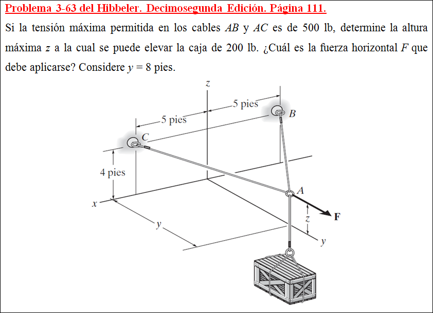 Si la tensión máxima permitida en los cables AB y AC es de 500 lb, determine la altura máxima z a la cual se puede elevar la caja de 200 lb. ¿Cuál es la fuerza horizontal F que debe aplicarse? Considere y = 8 pies.