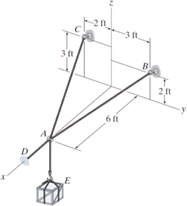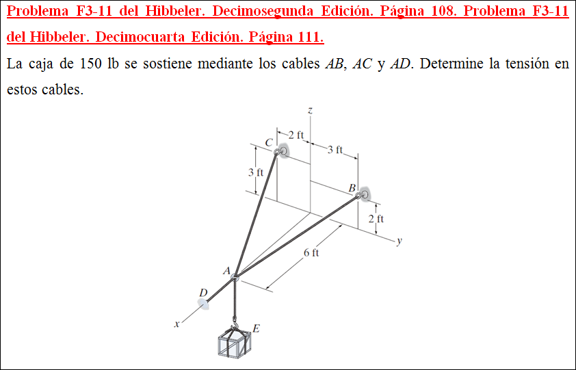 La caja de 150 lb se sostiene mediante los cables AB, AC y AD. Determine la tensión en estos cables.