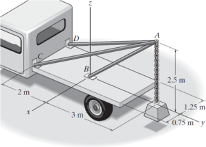 Determine la fuerza que actúa a lo largo del eje x de cada uno de los tres puntales necesarios para sostener el bloque de 500 kg.