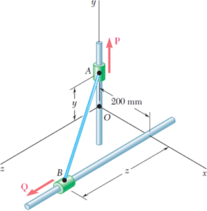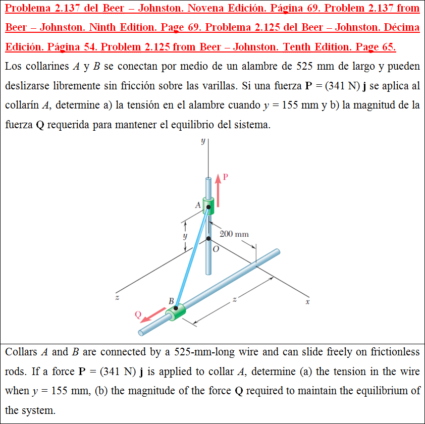 Los collarines A y B se conectan por medio de un alambre de 525 mm de largo y pueden deslizarse libremente sin fricción sobre las varillas. Si una fuerza P = (341 N) j se aplica al collarín A, determine a) la tensión en el alambre cuando y = 155 mm y b) la magnitud de la fuerza Q requerida para mantener el equilibrio del sistema.