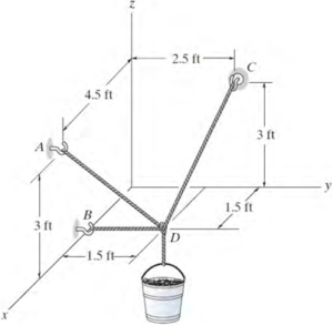 Si la cubeta y su contenido tienen un peso total de 20 lb, determine la fuerza en los cables de soporte DA, DB y DC.