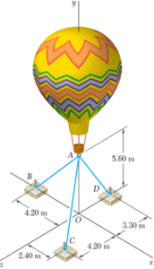 Se usan tres cables para amarrar el globo que se muestra en la figura. Determine la fuerza vertical P que ejerce el globo en A, si se sabe que la tensión en el cable AB es de 259 N.