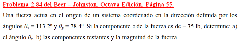 Una fuerza actúa en el origen de un sistema coordenado en la dirección definida por los ángulos θx = 113.2º y θy = 78.4º. Si la componente z de la fuerza es de – 35 lb, determine: a) el ángulo θz, b) las componentes restantes y la magnitud de la fuerza.