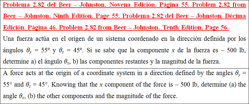 Una fuerza actúa en el origen de un sistema coordenado en la dirección definida por los ángulos θy = 55º y θz = 45º. Si se sabe que la componente x de la fuerza es – 500 lb, determine a) el ángulo θx, b) las componentes restantes y la magnitud de la fuerza.