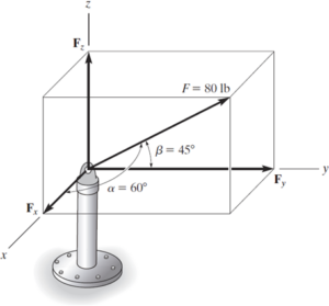 La fuerza F tiene una magnitud de 80 lb y actúa dentro del octante mostrado. Determine la magnitud de las componentes x, y y z de F.