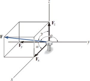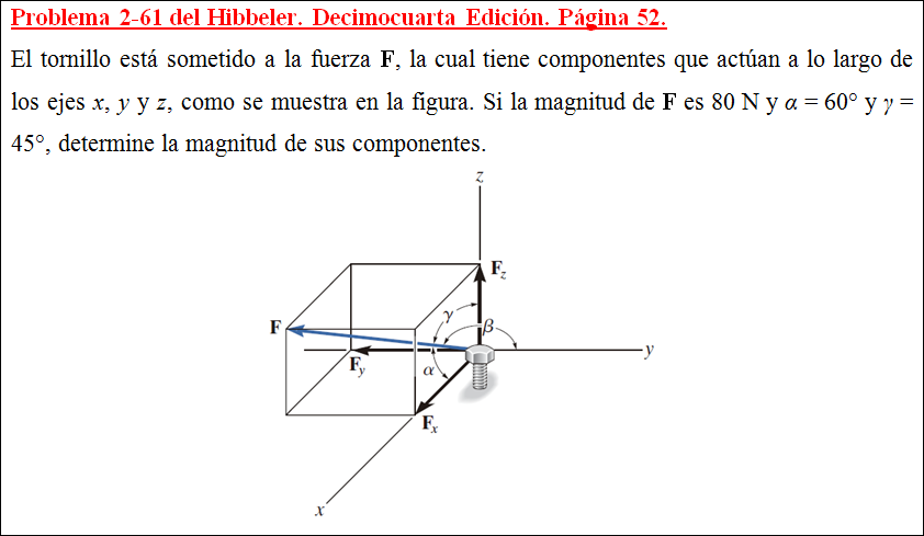 El tornillo está sometido a la fuerza F, la cual tiene componentes que actúan a lo largo de los ejes x, y y z, como se muestra en la figura. Si la magnitud de F es 80 N y α = 60° y γ = 45°, determine la magnitud de sus componentes.