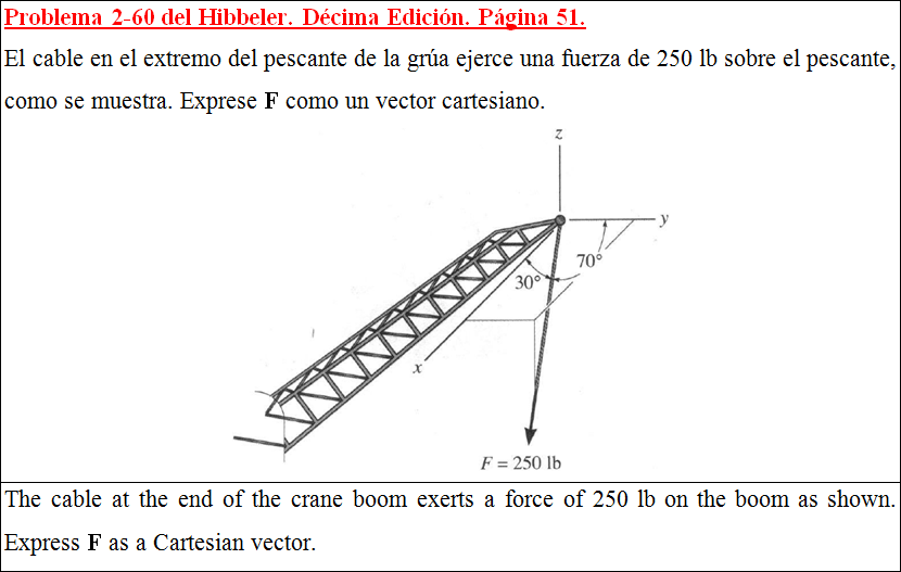 El cable en el extremo del pescante de la grúa ejerce una fuerza de 250 lb sobre el pescante, como se muestra. Exprese F como un vector cartesiano.