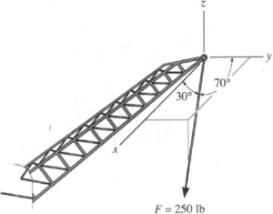 The cable at the end of the crane boom exerts a force of 250 lb on the boom as shown. Express F as a Cartesian vector.