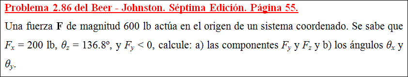 Una fuerza F de magnitud 600 lb actúa en el origen de un sistema coordenado. Se sabe que Fx = 200 lb, θz = 136.8º, y Fy < 0, calcule: a) las componentes Fy y Fz y b) los ángulos θx y θy.