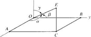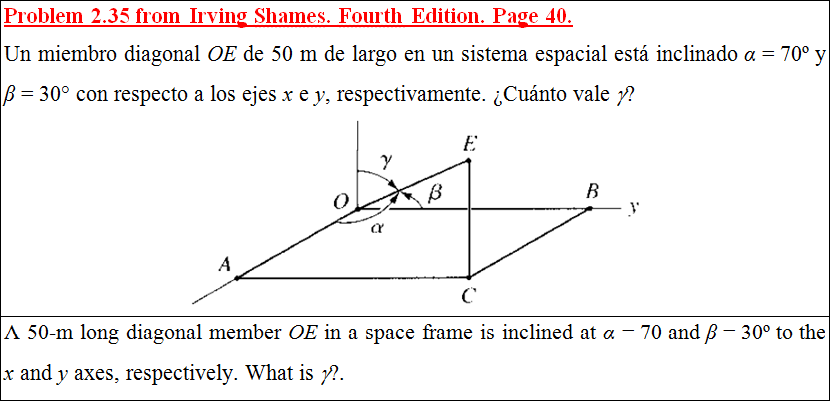 Un miembro diagonal OE de 50 m de largo en un sistema espacial está inclinado α = 70º y β = 30° con respecto a los ejes x e y, respectivamente. ¿Cuánto vale γ?