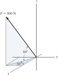Muestre como se descompone la fuerza en sus componentes x, y y z. Relacione con la figura el cálculo utilizado para determinar la magnitud de cada componente.