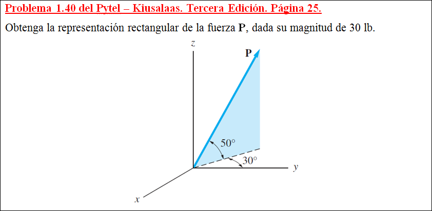 Obtenga la representación rectangular de la fuerza P, dada su magnitud de 30 lb.