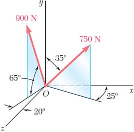 Determine a) las componentes x, y y z de la fuerza de 750 N y b) los ángulos θx, θy y θz que forma la fuerza con los ejes coordenados.