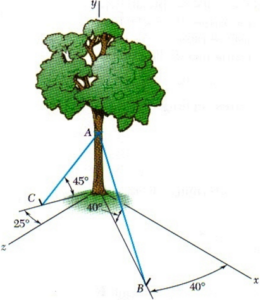 Para estabilizar un árbol parcialmente arrancado durante una tormenta, se amarran los cables AB y AC a la parte alta del tronco del árbol y después se fijan a barras de acero clavadas en el suelo. Si la tensión en el cable AC es de 3.6 kN, determine: a) las componentes de la fuerza ejercida por este cable sobre el árbol, y b) los ángulos θx, θy y θz que forma la fuerza en A con los ejes paralelos a los ejes coordenados.