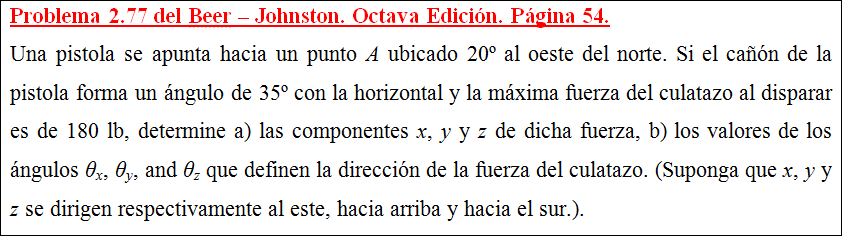 Una pistola se apunta hacia un punto A ubicado 20º al oeste del norte. Si el cañón de la pistola forma un ángulo de 35º con la horizontal y la máxima fuerza del culatazo al disparar es de 180 lb, determine a) las componentes x, y y z de dicha fuerza, b) los valores de los ángulos θx, θy, and θz que definen la dirección de la fuerza del culatazo. (Suponga que x, y y z se dirigen respectivamente al este, hacia arriba y hacia el sur.).