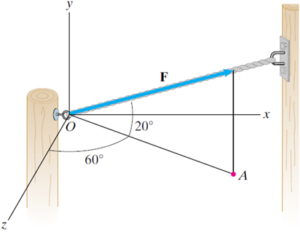 En la figura, la línea recta que va de la cabeza de F al punto A es paralela al eje y, y el punto A está contenido en el plano x–z. La componente x de F es Fx = 100 N.