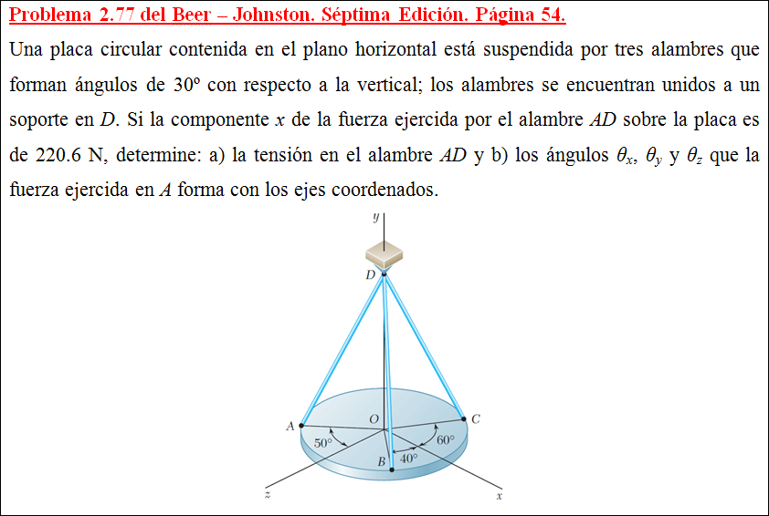 Una placa circular contenida en el plano horizontal está suspendida por tres alambres que forman ángulos de 30º con respecto a la vertical; los alambres se encuentran unidos a un soporte en D. Si la componente x de la fuerza ejercida por el alambre AD sobre la placa es de 220.6 N, determine: a) la tensión en el alambre AD y b) los ángulos θx, θy y θz que la fuerza ejercida en A forma con los ejes coordenados.