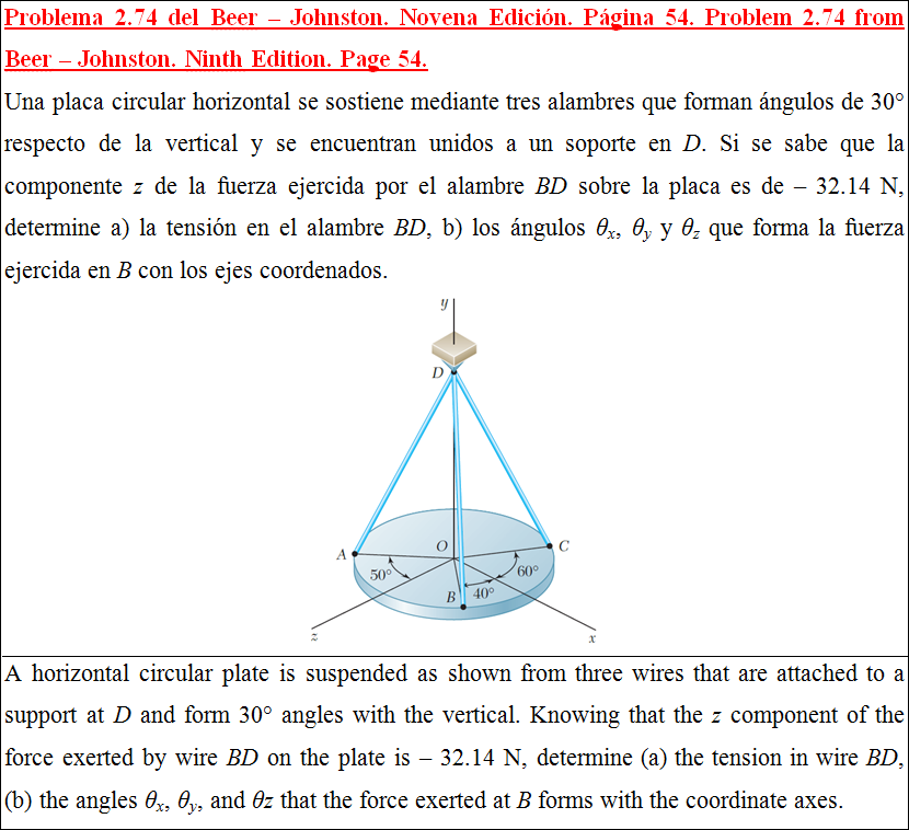 Una placa circular horizontal se sostiene mediante tres alambres que forman ángulos de 30° respecto de la vertical y se encuentran unidos a un soporte en D. Si se sabe que la componente z de la fuerza ejercida por el alambre BD sobre la placa es de – 32.14 N, determine a) la tensión en el alambre BD, b) los ángulos θx, θy y θz que forma la fuerza ejercida en B con los ejes coordenados.