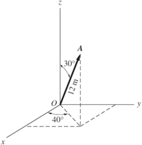 Con referencia a la figura, determine: 1. la representación rectangular del vector posición A y 2. los ángulos entre A y cada uno de los ejes coordenados positivos.