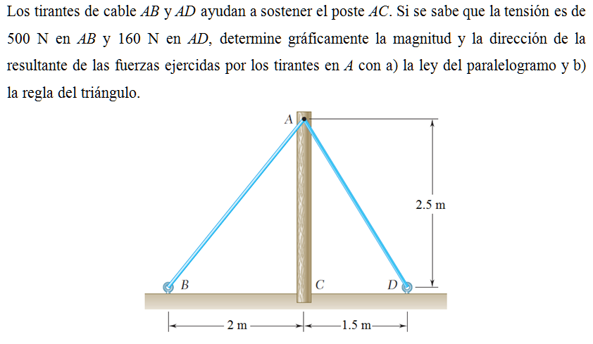 Los tirantes de cable AB y AD ayudan a sostener el poste AC. Si se sabe que la tensión es de 500 N en AB y 160 N en AD, determine gráficamente la magnitud y la dirección de la resultante de las fuerzas ejercidas por los tirantes en A con a) la ley del paralelogramo y b) la regla del triángulo.