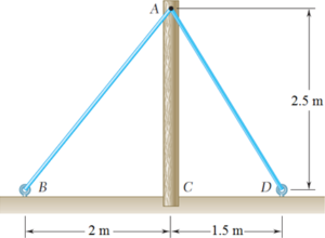 The cable stays AB and AD help support pole AC. Knowing that the tension is 500 N in AB and 160 lb in AD, determine graphically the magnitude and direction of the resultant of the forces exerted by the stays at A using a) the parallelogram law, b) the triangle rule.