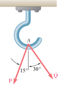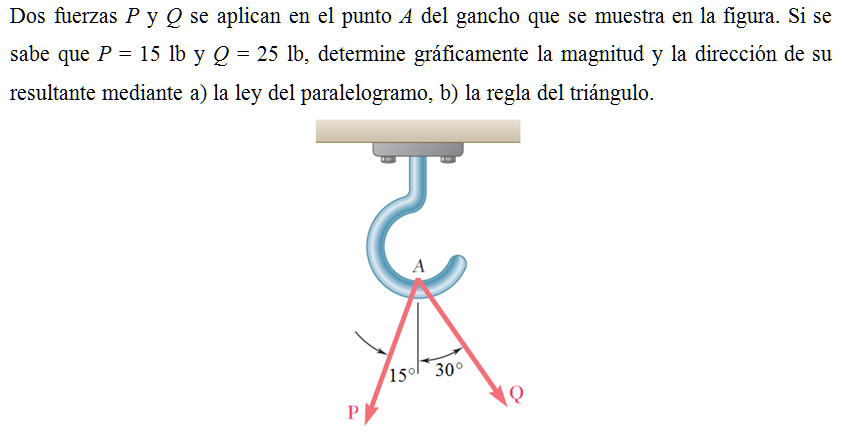 Dos fuerzas P y Q se aplican en el punto A del gancho que se muestra en la figura. Si se sabe que P = 15 lb y Q = 25 lb, determine gráficamente la magnitud y la dirección de su resultante mediante a) la ley del paralelogramo, b) la regla del triángulo.