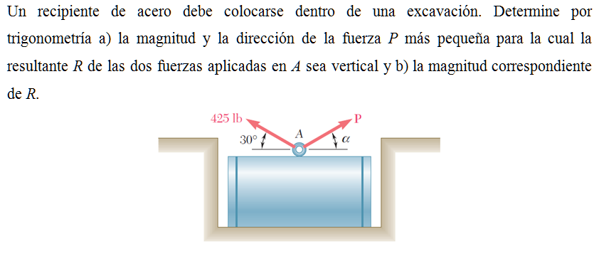 Un recipiente de acero debe colocarse dentro de una excavación. Determine por trigonometría a) la magnitud y la dirección de la fuerza P más pequeña para la cual la resultante R de las dos fuerzas aplicadas en A sea vertical y b) la magnitud correspondiente de R.