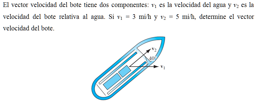 El vector velocidad del bote tiene dos componentes: v1 es la velocidad del agua y v2 es la velocidad del bote relativa al agua. Si v1 = 3 mi/h y v2 = 5 mi/h, determine el vector velocidad del bote.
