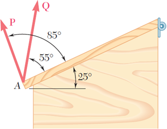 Dos fuerzas P y Q se aplican a la tapa de un cajón de almacenamiento, como se muestra en la figura. Si se sabe que P = 60 N y Q = 48 N, determine por trigonometría la magnitud y la dirección de la resultante de las dos fuerzas.