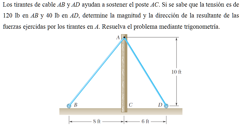 Los tirantes de cable AB y AD ayudan a sostener el poste AC. Si se sabe que la tensión es de 120 lb en AB y 40 lb en AD, determine la magnitud y la dirección de la resultante de las fuerzas ejercidas por los tirantes en A. Resuelva el problema mediante trigonometría.