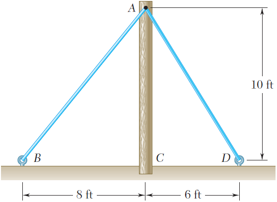 The cable stays AB and AD help support pole AC. Knowing that the tension is 120 lb in AB and 40 lb in AD, determine graphically the magnitude and direction of the resultant of the forces exerted by the stays at A. Solve by trigonometry.