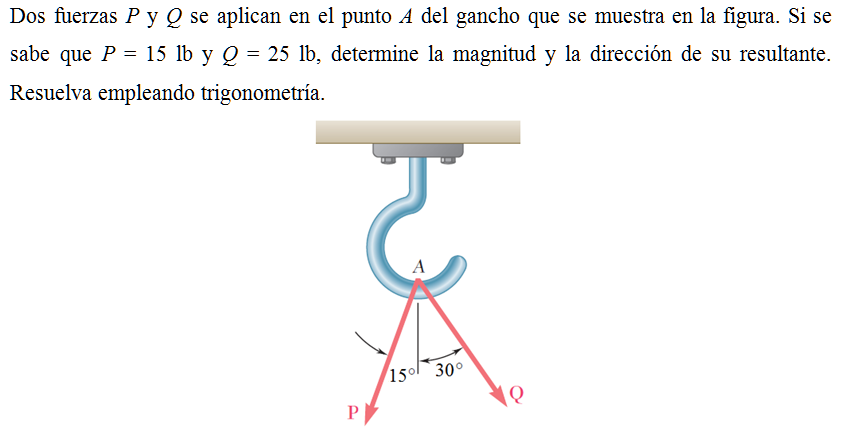 Dos fuerzas P y Q se aplican en el punto A del gancho que se muestra en la figura. Si se sabe que P = 15 lb y Q = 25 lb, determine la magnitud y la dirección de su resultante. Resuelva empleando trigonometría.