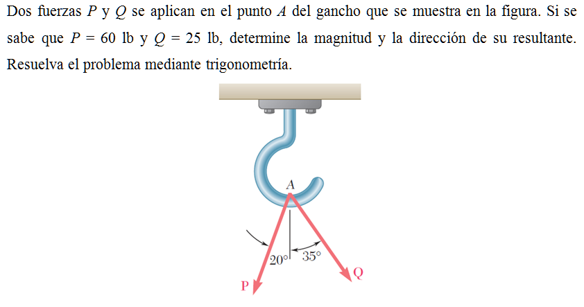 Dos fuerzas P y Q se aplican en el punto A del gancho que se muestra en la figura. Si se sabe que P = 60 lb y Q = 25 lb, determine la magnitud y la dirección de su resultante. Resuelva el problema mediante trigonometría.
