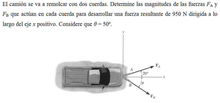 El camión se va a remolcar con dos cuerdas. Determine las magnitudes de las fuerzas FA y FB que actúan en cada cuerda para desarrollar una fuerza resultante de 950 N dirigida a lo largo del eje x positivo. Considere que θ = 50º.