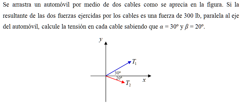 Se arrastra un automóvil por medio de dos cables como se aprecia en la figura. Si la resultante de las dos fuerzas ejercidas por los cables es una fuerza de 300 lb, paralela al eje del automóvil, calcule la tensión en cada cable sabiendo que α = 30º y β = 20º.